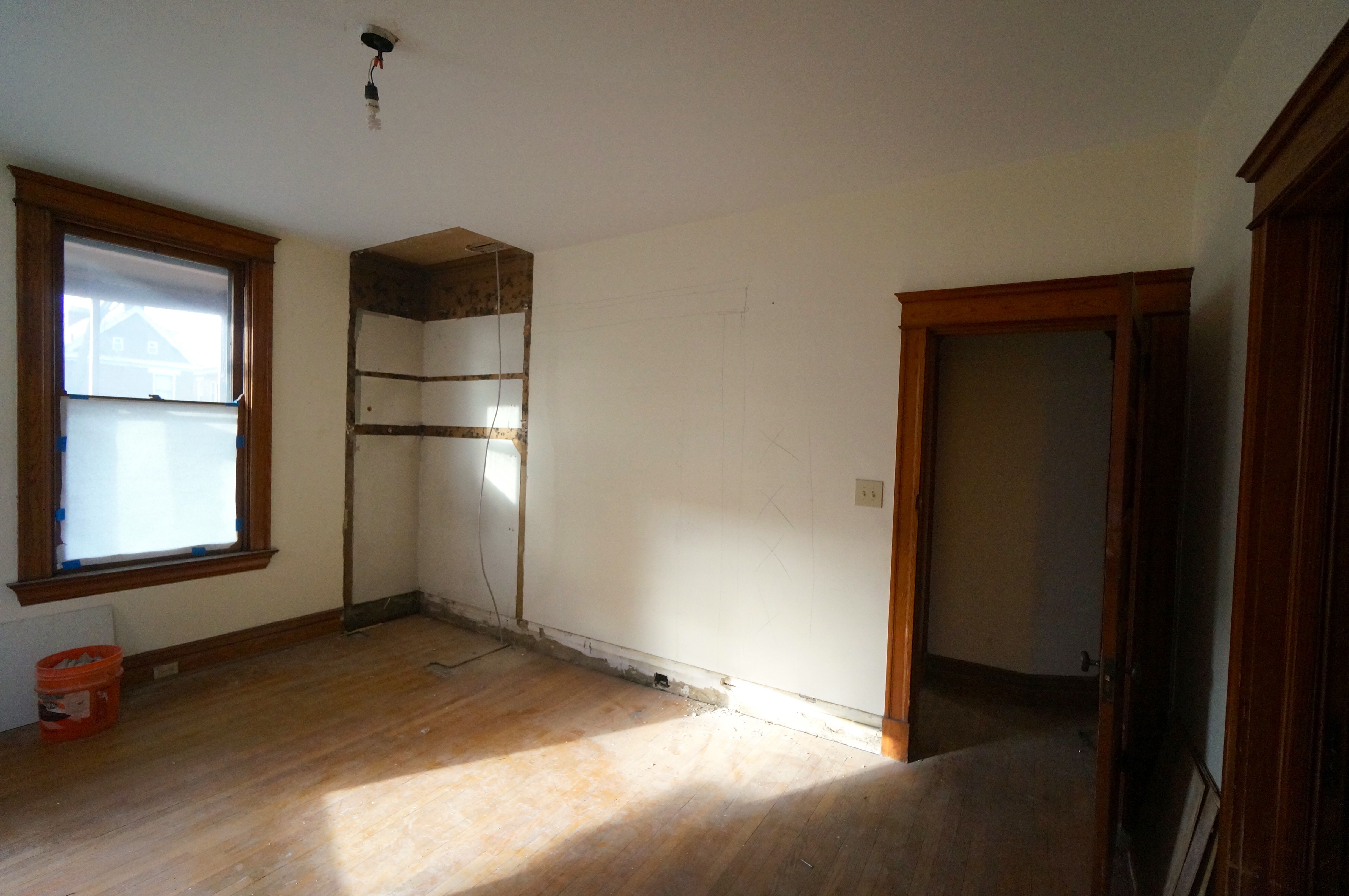 The dining room had a closet probably built the same time the house was converted into a two-family. In the next photo, you’ll see a detail shot of the wallpaper that was hidden. It was above the closet’s false ceiling.