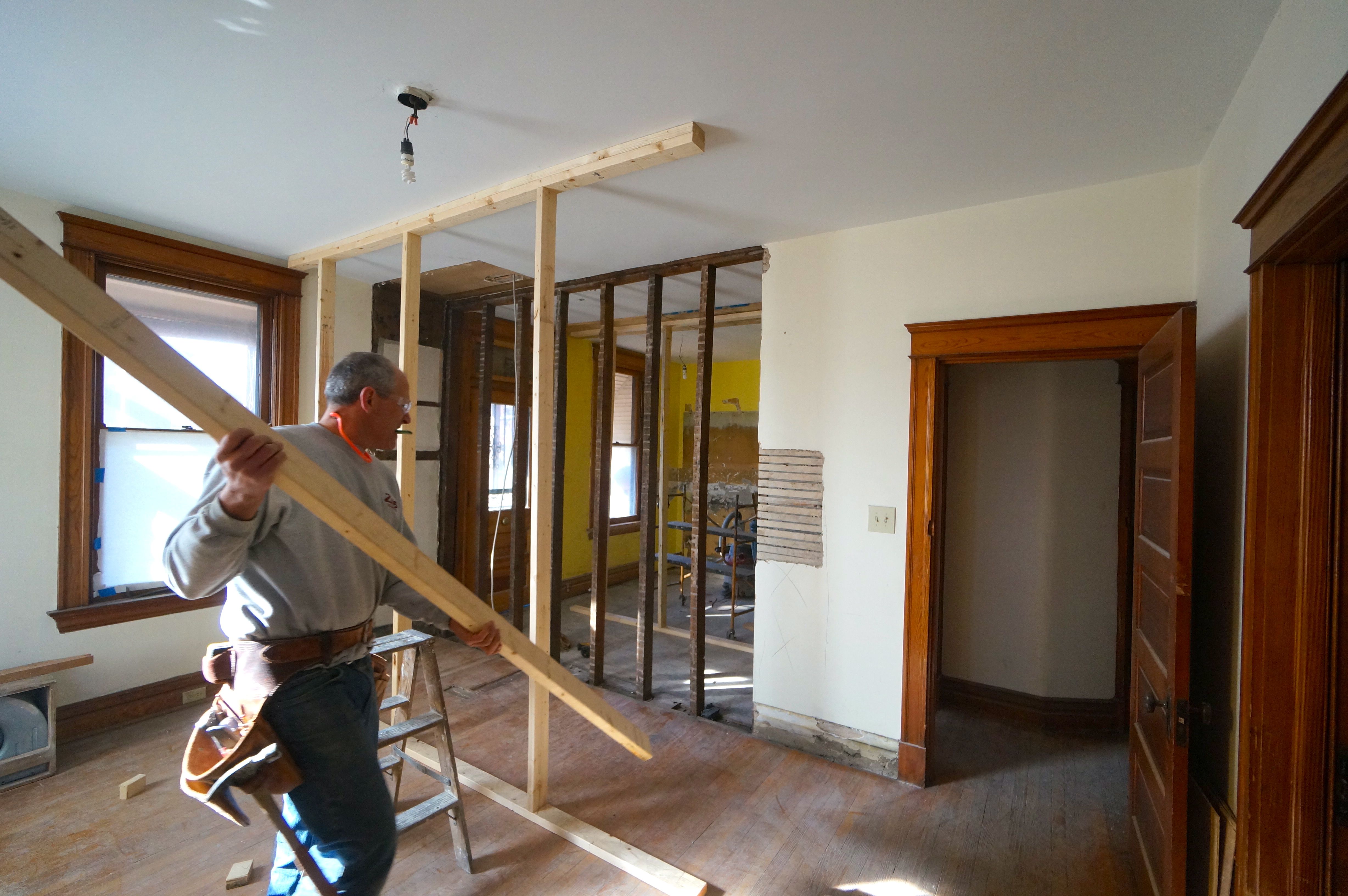 My brother, Robbert, helped install the structural beams. Before removing the old studs, we had to support the existing load bearing floor joists.
