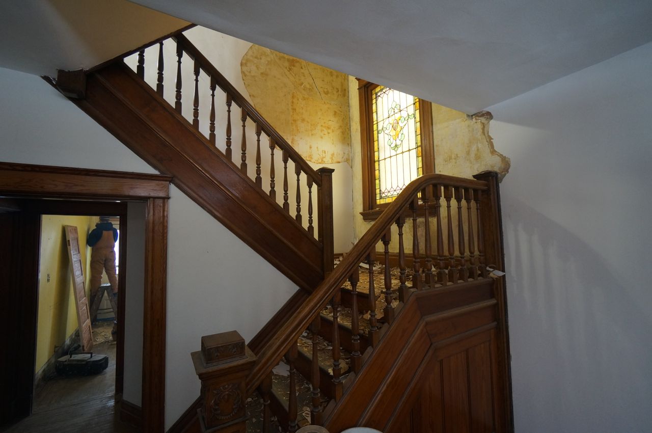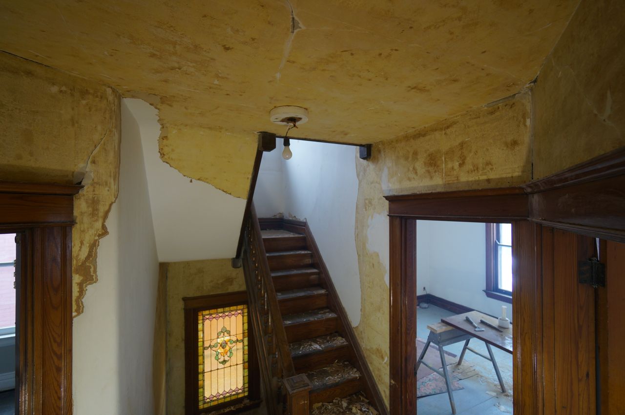 I’m okay if it’s well adhered; it can work like “Glidwall,” hiding the cracks in the plaster. Once it starts to peel back, though, it’s often hard to know when to stop taking it off. Many of the rooms have a few layers, so they’re fine, and I leave it alone. The second floor hall and third floor were a different story.