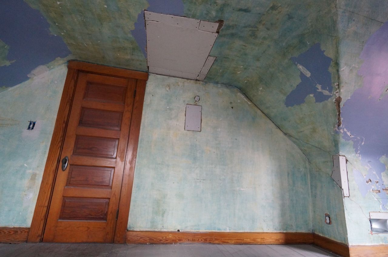 The two rooms on the third floor were painted blue. The back room had poorly adhered paper, which I easily removed. The front room was tough to remove, so I left it, except around the cracks where it was easier to remove.