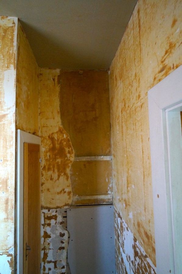 The first floor bathroom. There’s some interesting history here; there was a service stairs leading from the kitchen to the main stairwell that was removed when the full bath was built in 1941. the darker color was the original kitchen color with the rest being part of the remodel. We removed the bathtub and tile and made the walls smooth using glidwall.